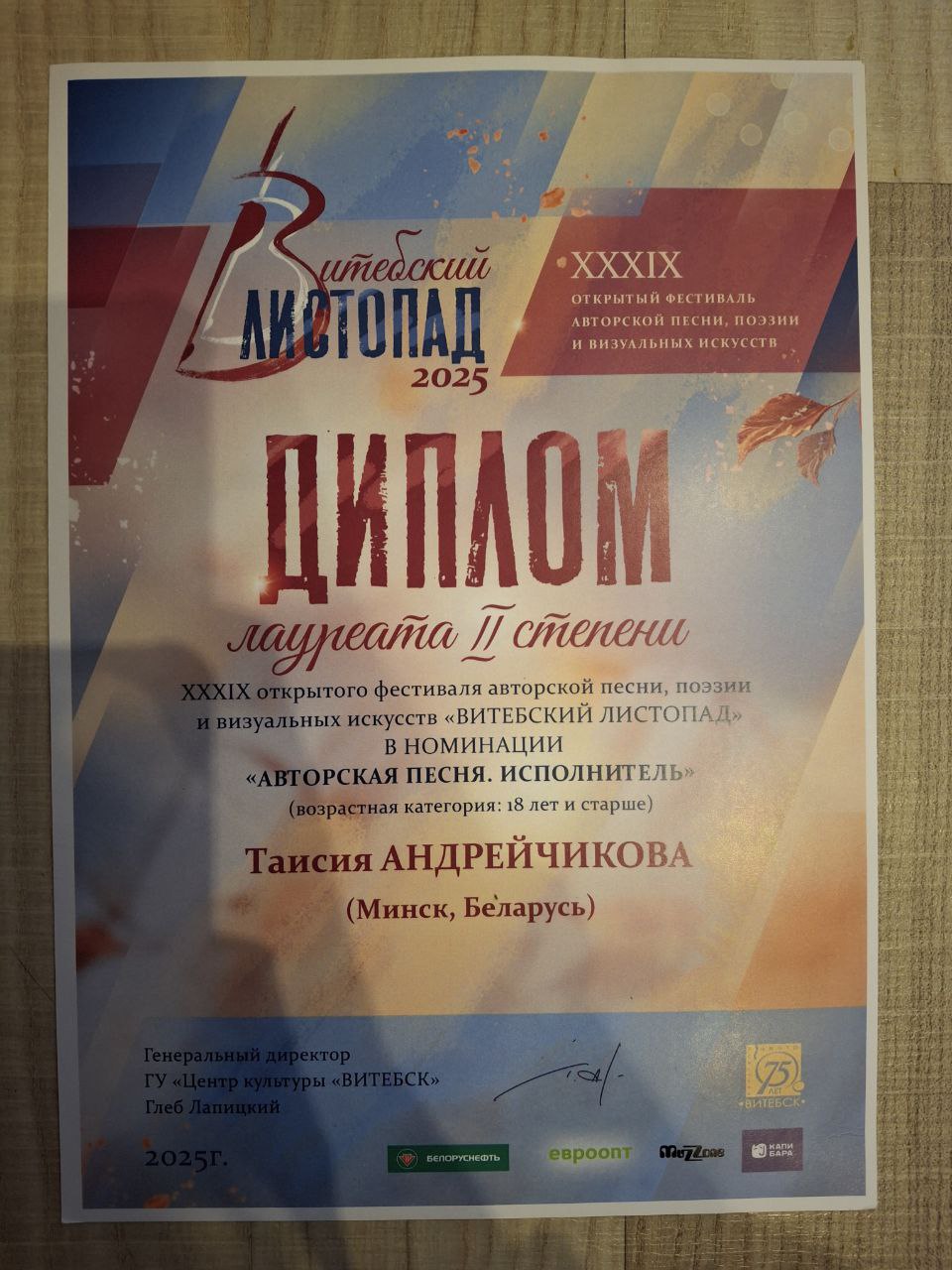 Студентка 2-го курса специальности «Дизайн предметно- пространственной среды» Таисия Андрейчикова приняла участие в открытом фестивале авторской песни, поэзии и визуальных искусств «ВИТЕБСКИЙ ЛИСТОПАД».
