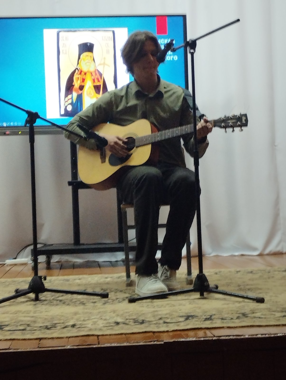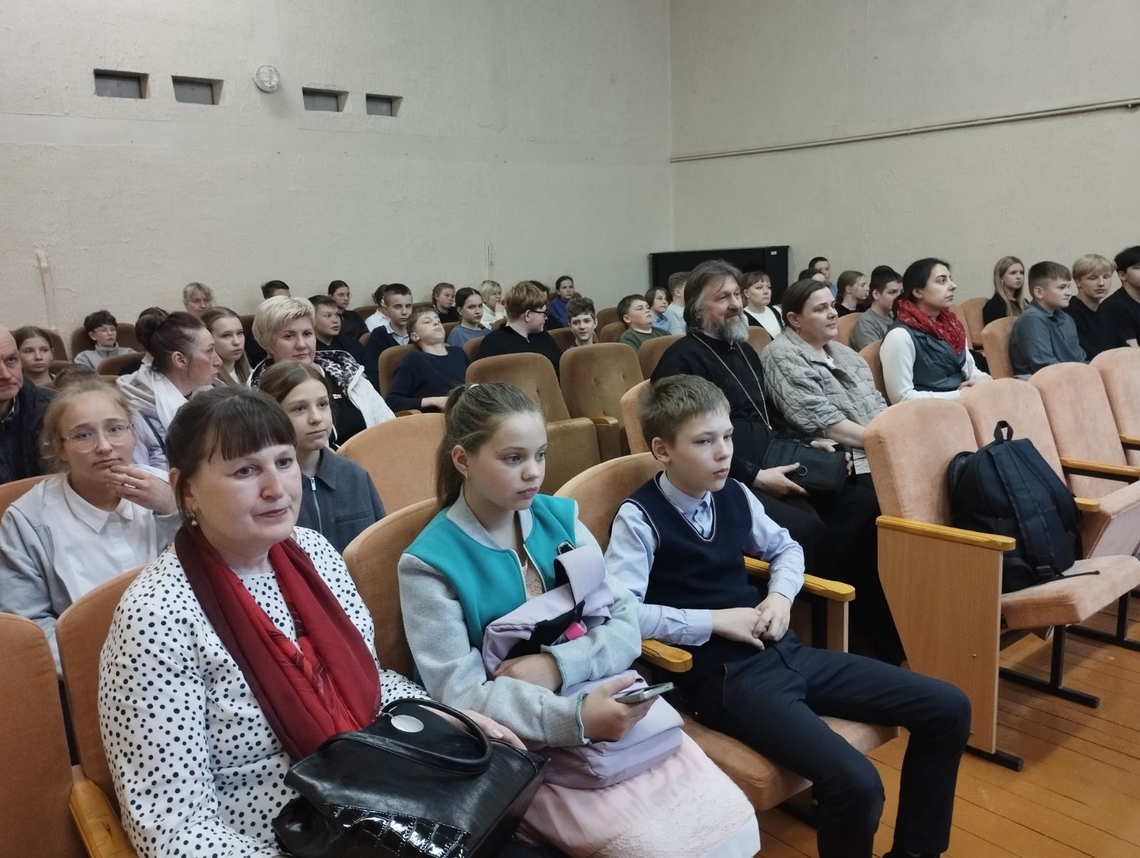 В зале собрались старшеклассники и прихожане местного прихода Покрова Пресвятой Богородицы. Выступление прошло с большим интересом и воодушевлением, сопровождал его протоиерей Евгений Горячко.