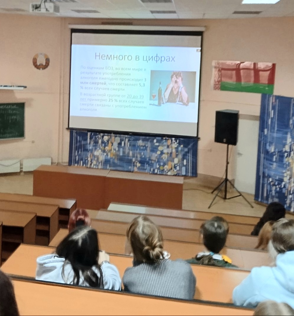 23.09.2025 в рамках Недели здорового образа жизни "Сделай правильный выбор" врачом-педатром Центра дружественного подросткам "Вместе" Горгун Юлией Александровной проведена лекция для студентов гуманитарного факультета и факультета искусств на тему: "Профилактика алкоголизма".