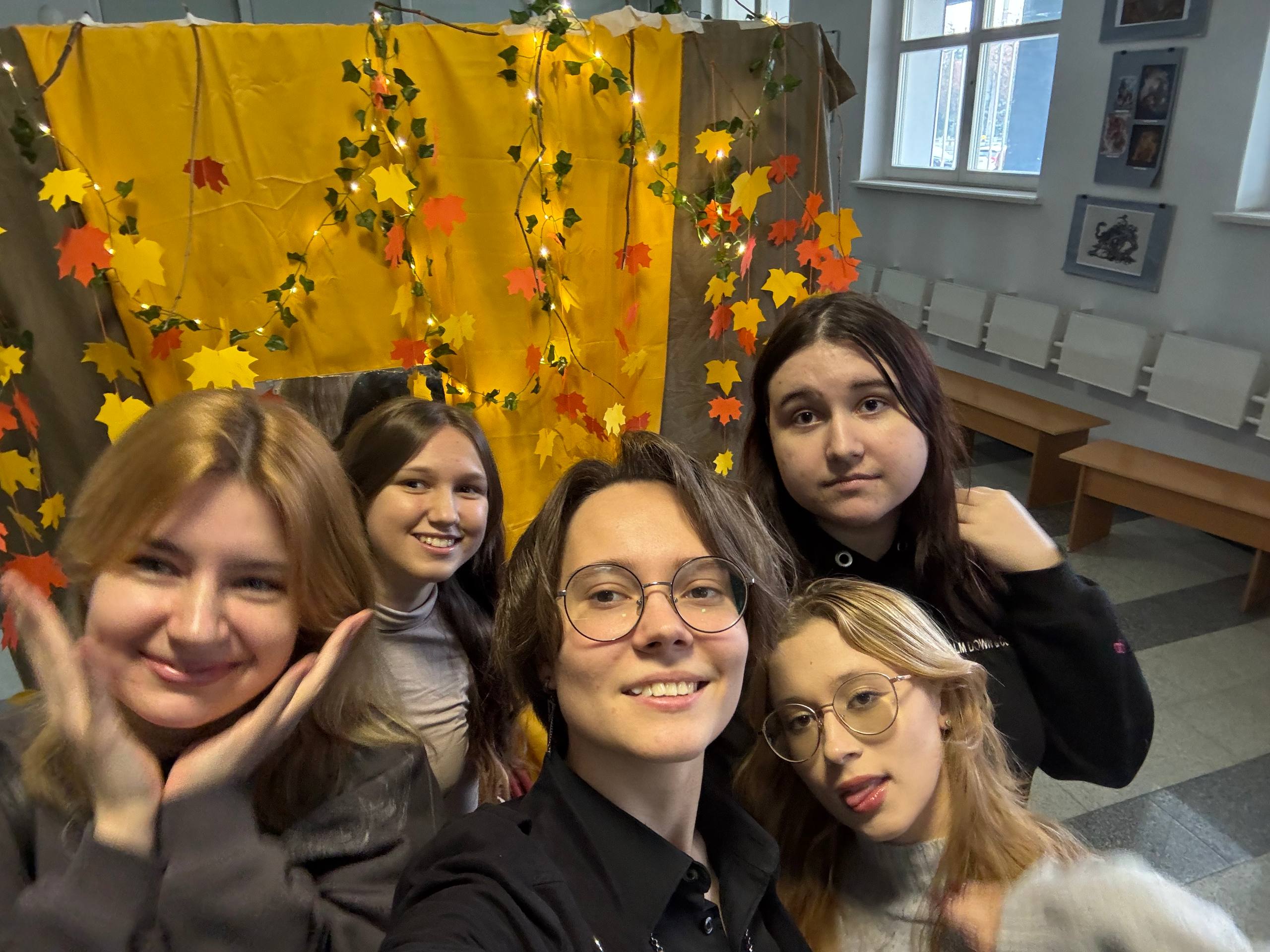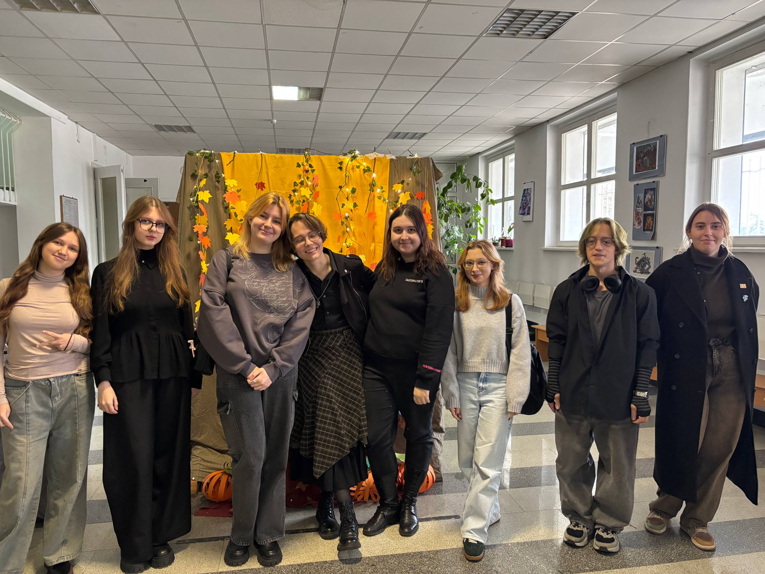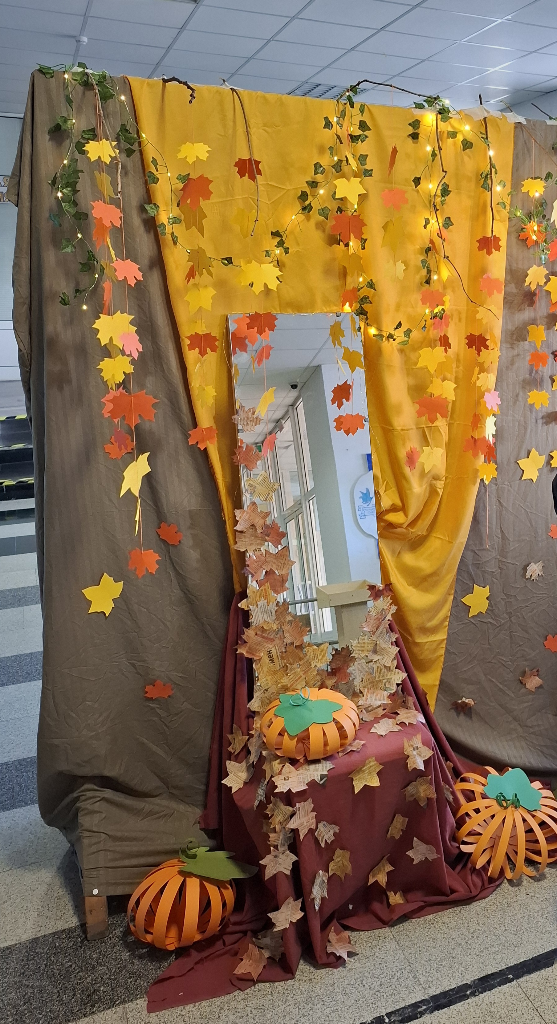 4-5 ноября в холле Института проходила удивительная и немножко таинственная акция «Лістападнік-2025». Она была задумана и проведена творческим студенческим активом факультета искусств. Оформлена “говорящая” осенняя экспозиция: яркие подвижные от легкого дуновения листья, удивительно похожие на настоящие бумажные тыквы и неповторимая голубизна неба … У студентов и сотрудников Института была возможность почувствовать красоту этой поры года и вообразить себя немножко в зазеркалье: выбрать предсказание, оставить свое пожелание, вспомнить персонажей из белорусской мифологии, ответить на загадки и главное – улыбнуться и передать хорошее осеннее настроение.