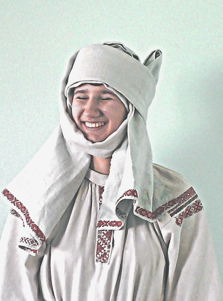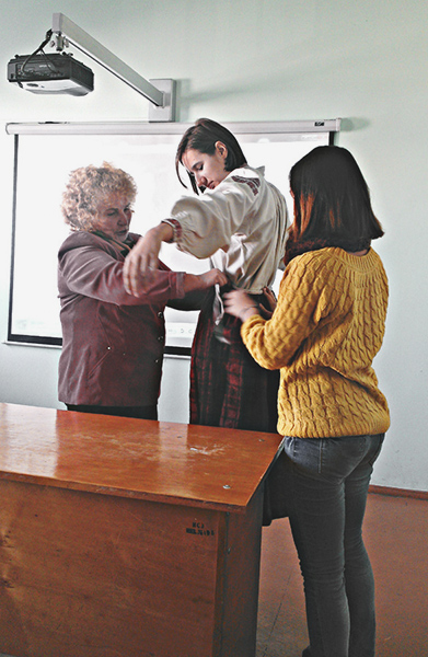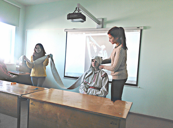 Но примерить на себя традиционный народный костюм без специальных навыков оказалось не так просто. Сначала студенты посмотрели видео урок о том, как правильно надевать старинную одежду. А затем попробовали сделать это сами. Одна из студенток, Рената Степанова, выступила в качестве модели. При этом ей понадобилась помощь преподавателя и однокурсниц. Для того, чтобы надеть костюм полностью и по всем правилам, включая завивание намитки, у будущих модельеров ушло более 40 минут. Затем состоялся обмен впечатлениями. Студенты отметили, что в старинной женской одежде вряд ли будешь идти угловатой и суетливой походкой, делать резкие движения, а невольно хочется выпрямиться и поднять голову, ступать мягко, женственно и аккуратно.