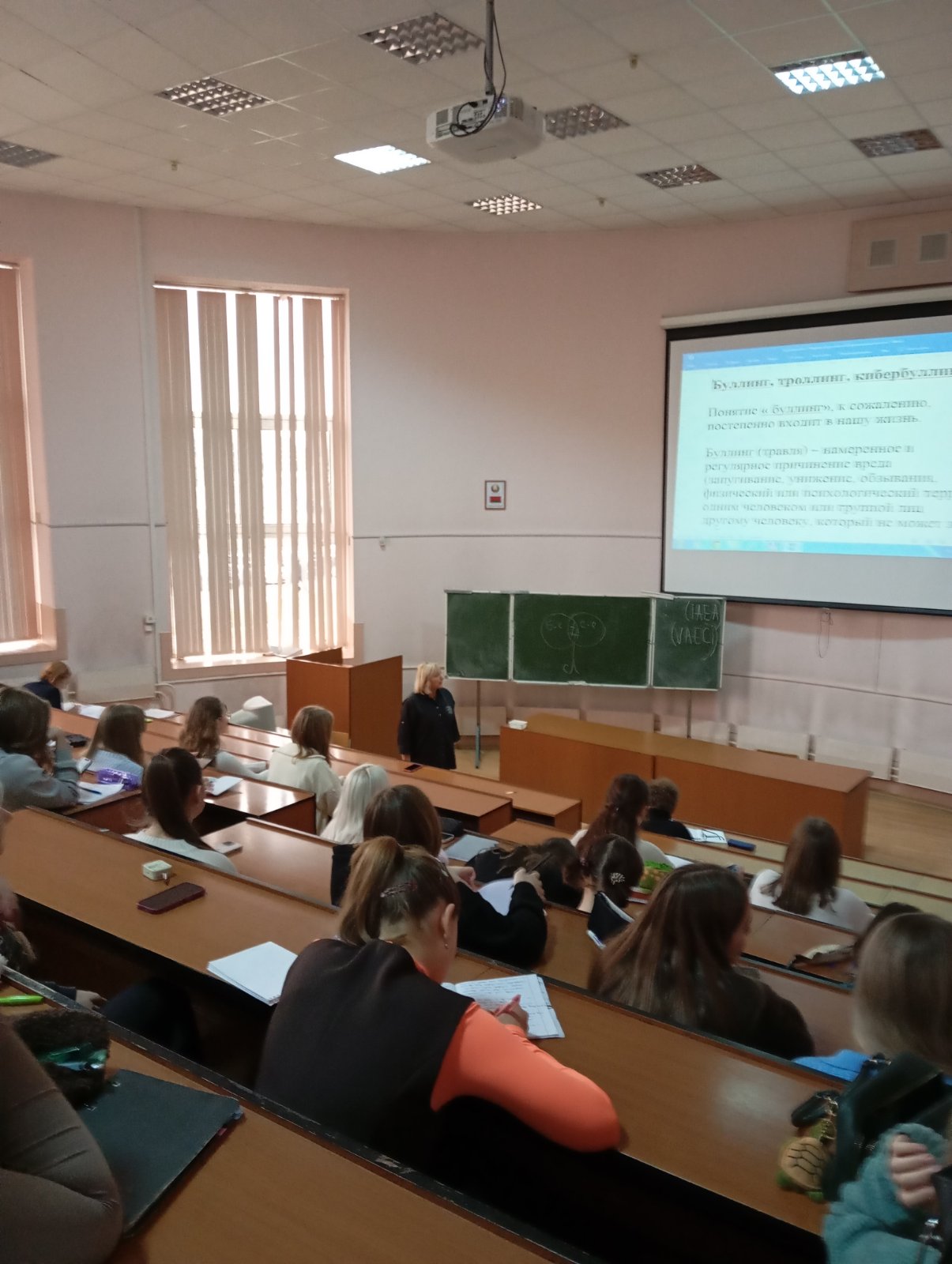 21.10.2025 в рамках месячника по профилактике насилия "Жизнь без насилия" психологом Центра дружественного подросткам "Вместе" Азаровой Л.П. проведена для студентов-первокурсников лекция на тему: "Буллинг и кибербуллинг в молодёжной среде".