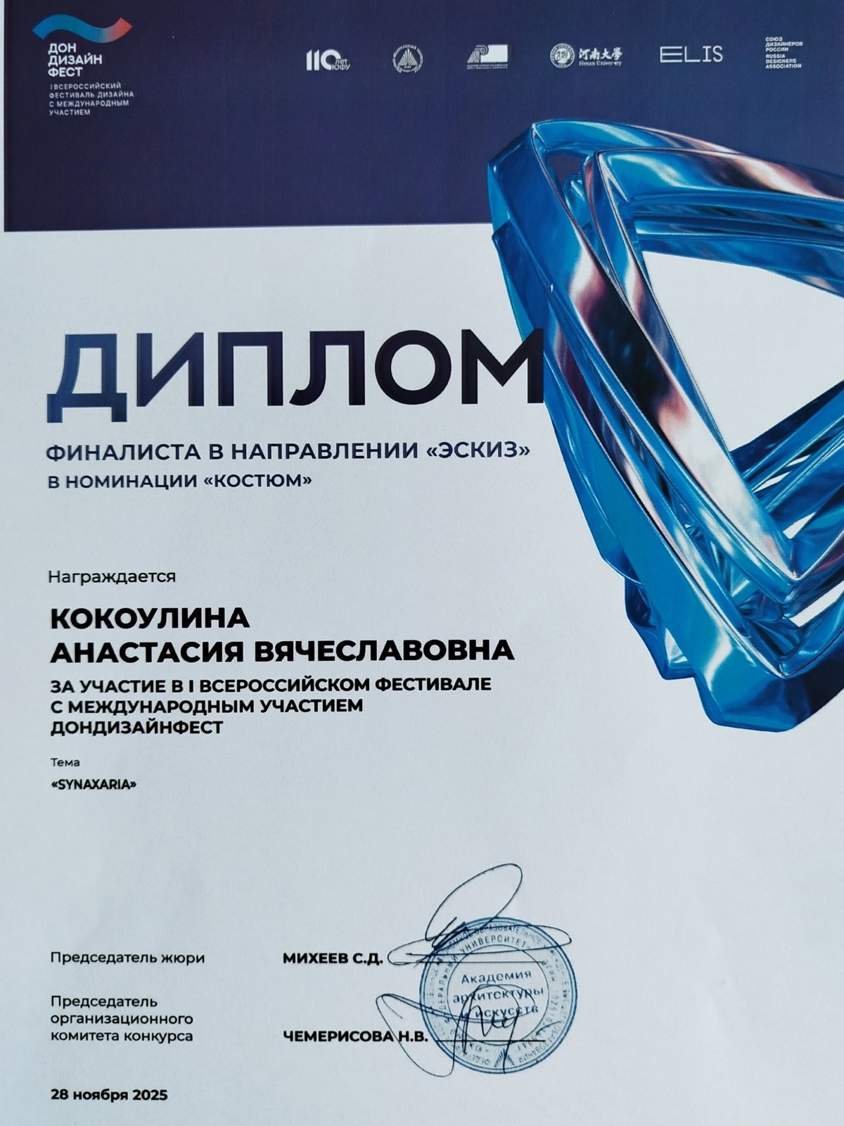 Эскизы костюмов и графические композиции представили студенты старших курсов Института и недавние выпускники: Никита Станкевич, Анастасия Кокоулина, Даниил Суша, Данила Полевой, Анастасия Метто и Анжелика Осиновская. Все они получили специальные сертификаты участников отборочного тура фестиваля. Дипломами финалистов в направлении «Эскиз» награждены Анастасия Метто (номинация «Авторская графика») и Анастасия Кокоулина (номинация «Костюм»), в направлении «Проект» - Никита Станкевич.